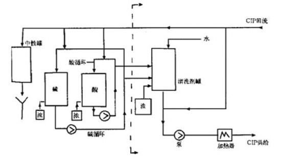 圖2所示的CIP清洗裝置的特點:水、堿、酸等各種清洗液分別放在各自的貯桶里,清洗完堿、酸等溶液后回收。當清洗液濃度降低時補充酸、堿清洗液后再重復使用。