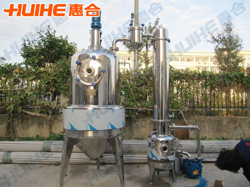 真空減壓濃縮器(罐)是將提取好的液加熱沸騰,蒸發(fā)水份,在被蒸發(fā)的二次蒸汽中帶有有效成份的泡沫在汽液分離器中分離出來回流缸內(nèi)。