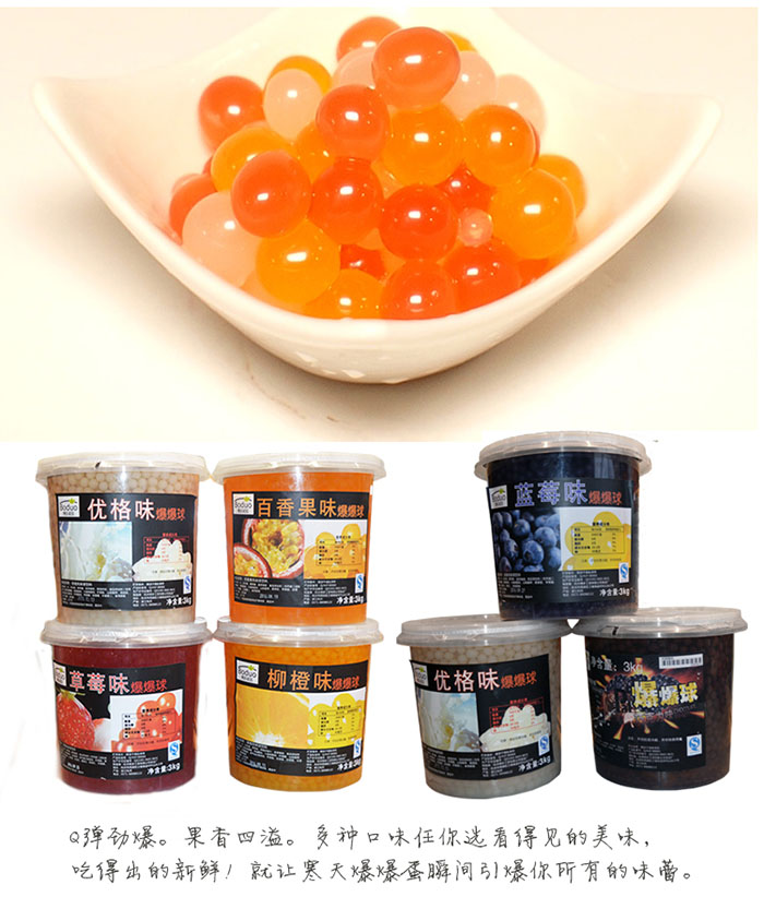 魔力豆(爆爆珠): 外覆海藻膠薄膜,內包果汁;經低溫殺菌,可常溫保存一年,使用方便。(開啟后須冷藏)。柳橙爆爆蛋以新鮮柳橙為原料經過調配、殺菌、灌裝等工序生產的果汁飲料產品。